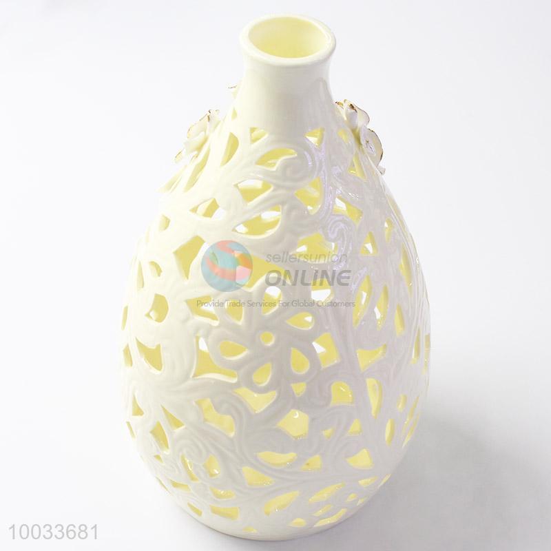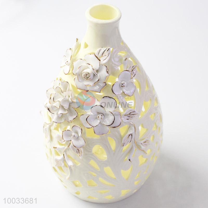 16*30cm New Design Hollow Beige Handmade Ceramic Crafts Vase with Three-dimensional Flowers Pattern