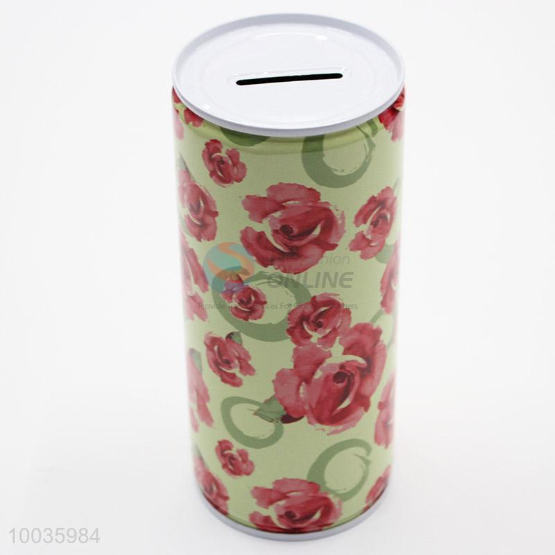 Green Kids Iron Money Box Shaped in cylinder with Red Flowers Pattern