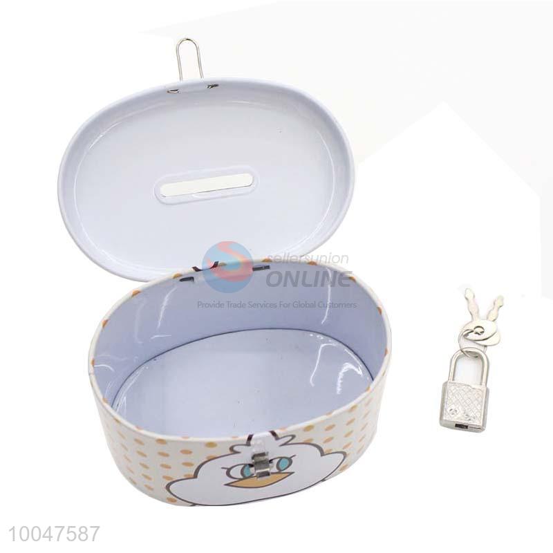 Cute yellow tinplate money box with lock