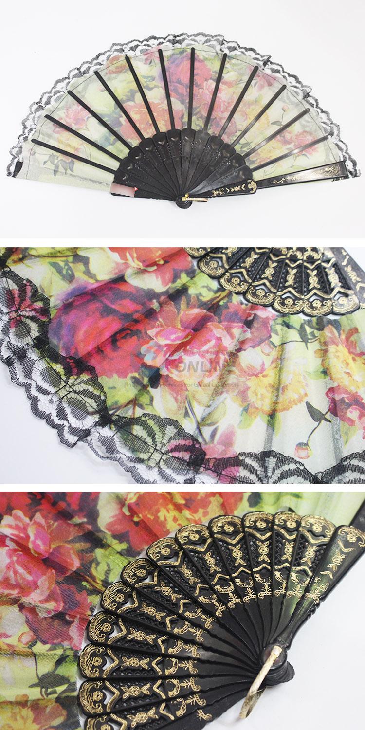 Wholesale 23*43CM Folding Hand Fan with Black Sticks&Lace and Colourful Flowers Pattern
