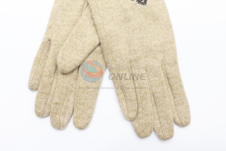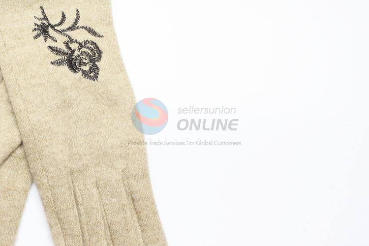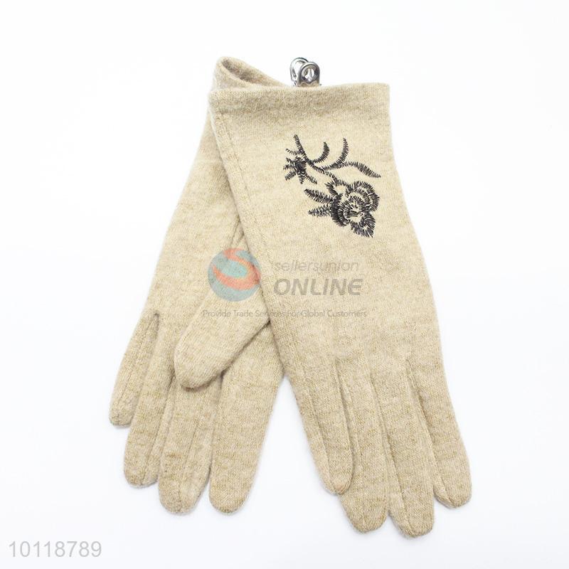 Beige Cashmere Gloves with Embroidery Flower