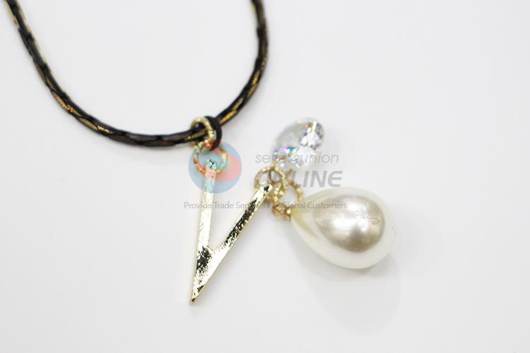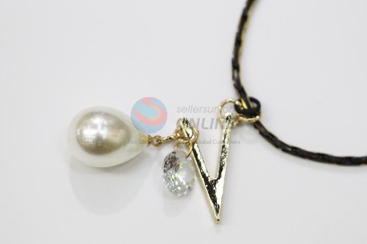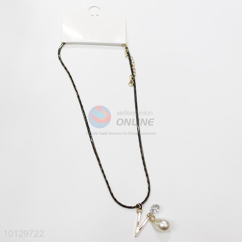 Stylish black rope waterdrop shaped pearl V shaped alloy necklace
