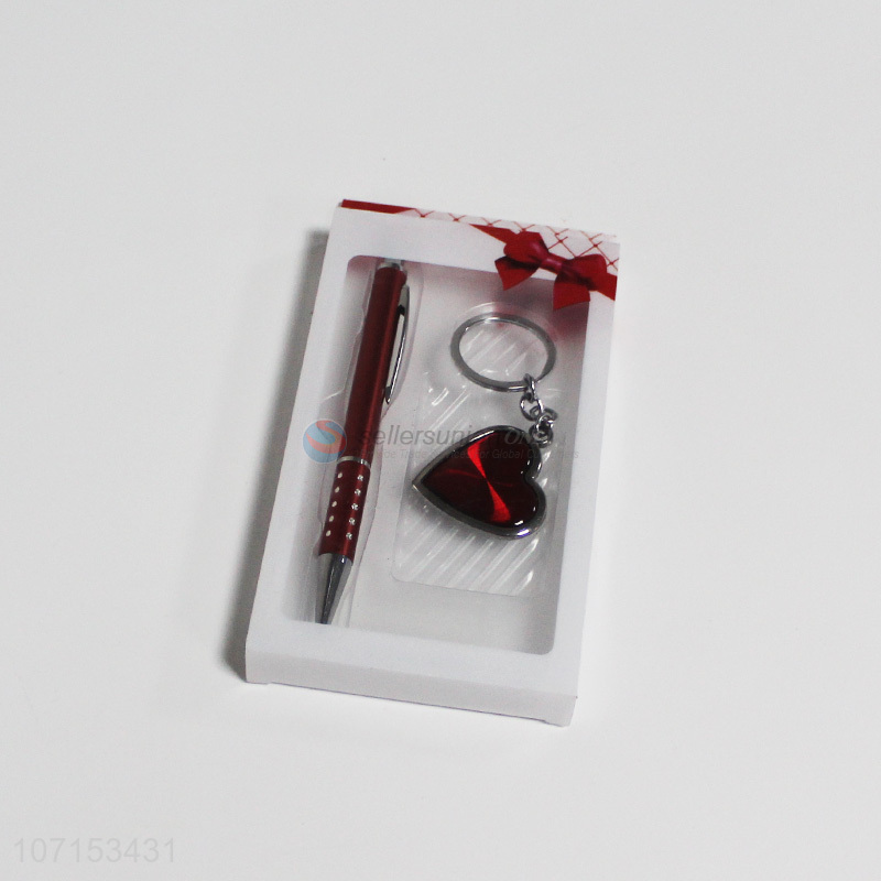 Popular design women business gift set metal heart key chain and pen set