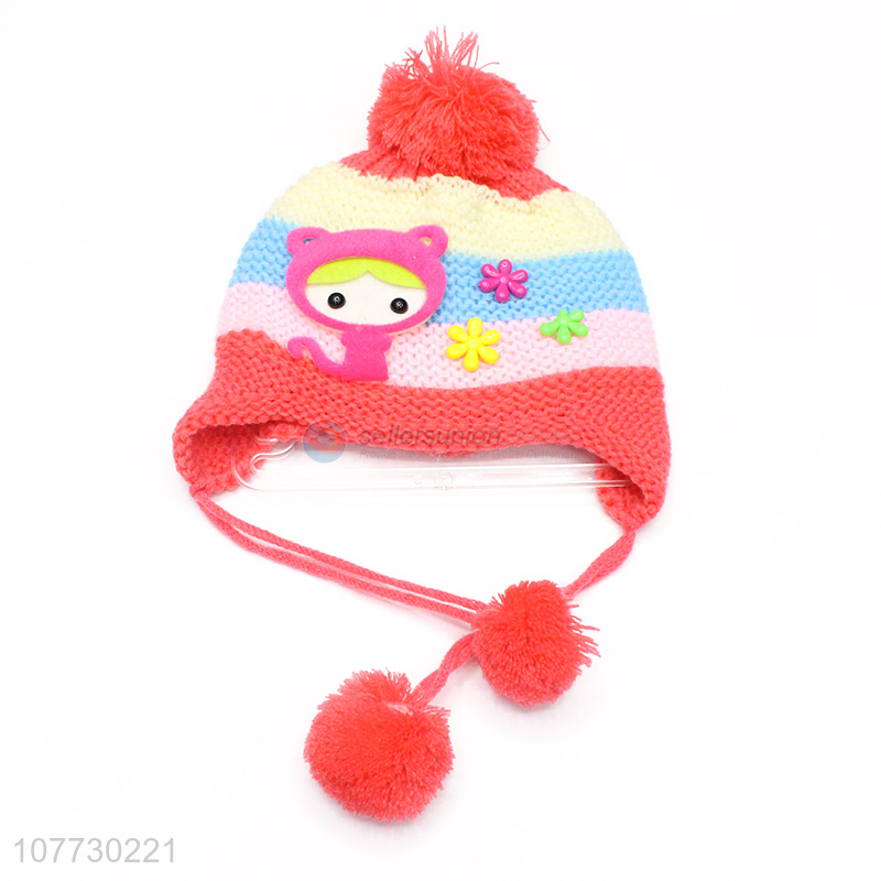 Low price children winter hat with earflaps kids pompom beanies