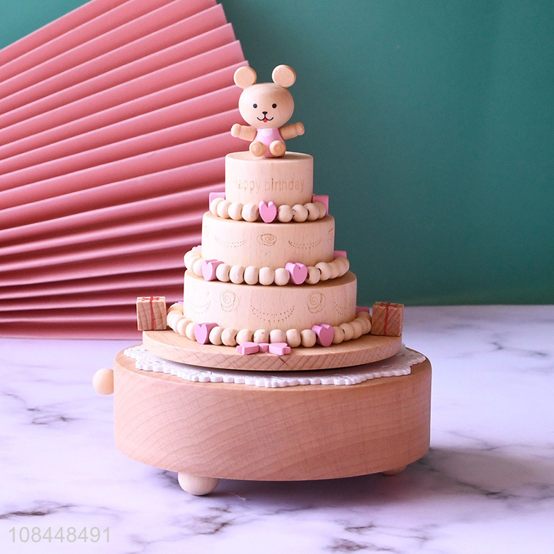 Wholesale bear cake music box beech wooden rotating musical box birthday gifts