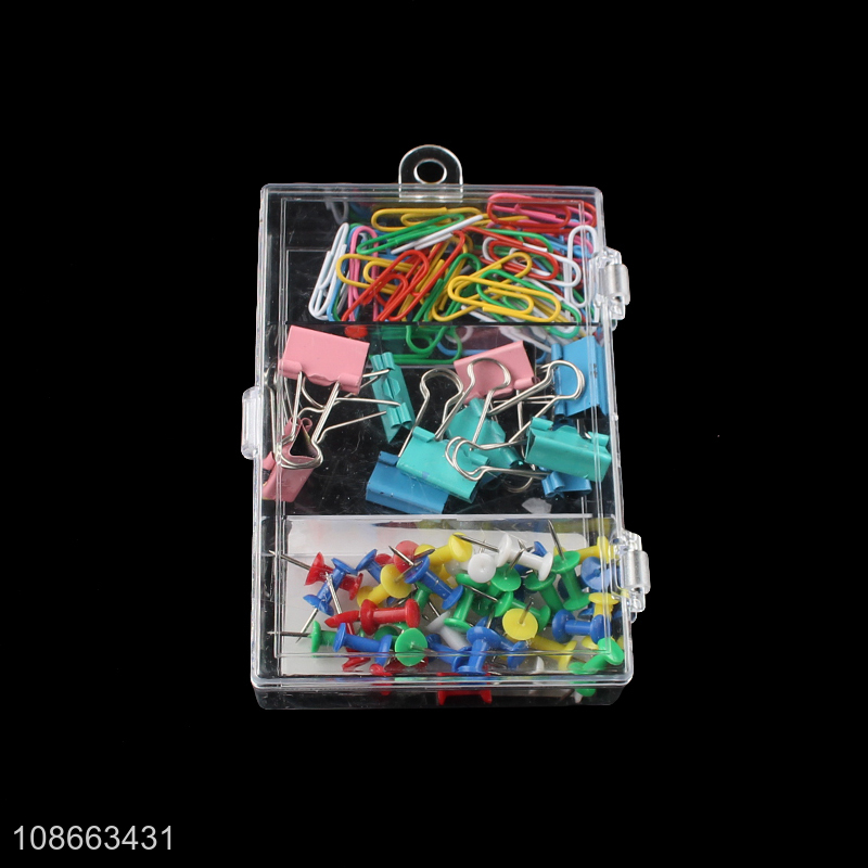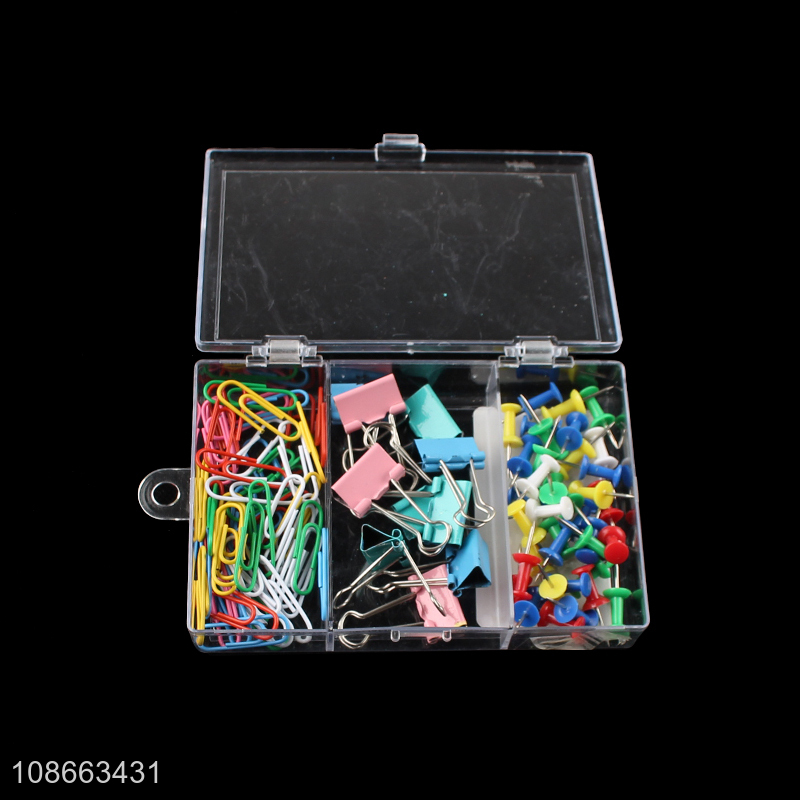 Wholesale office clips set with 50pcs paper clips, 40pcs push pins & 10pcs binder clips