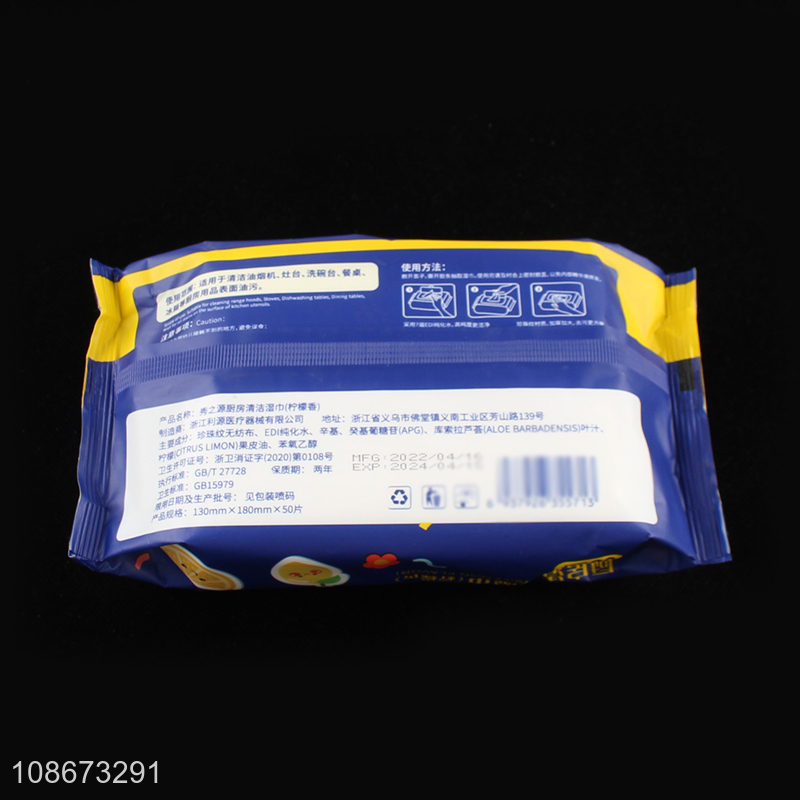 Hot selling 50 sheets lemon scented nonwovens disposable kitchen wet wipes