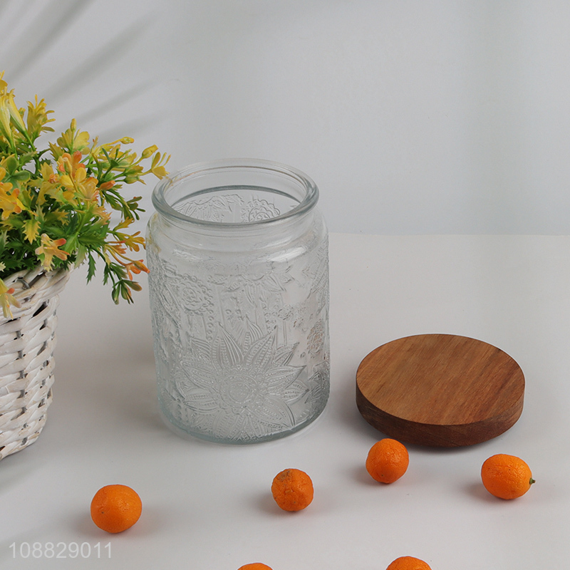 Wholesale clear flower embossed glass storage jar with airtight wooden lid