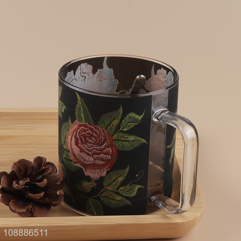 Hot sale flower pattern glass water cup drinking cup with handle