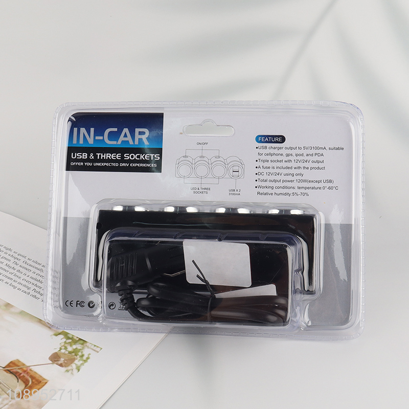 High Quality 120W 3-Socket Car Cigarette Lighter USB Charger for Car Device