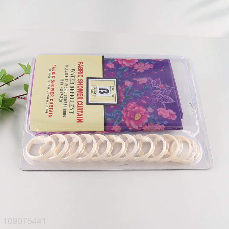 Good quality waterproof fabric shower curtain with 12 fabric couered rings