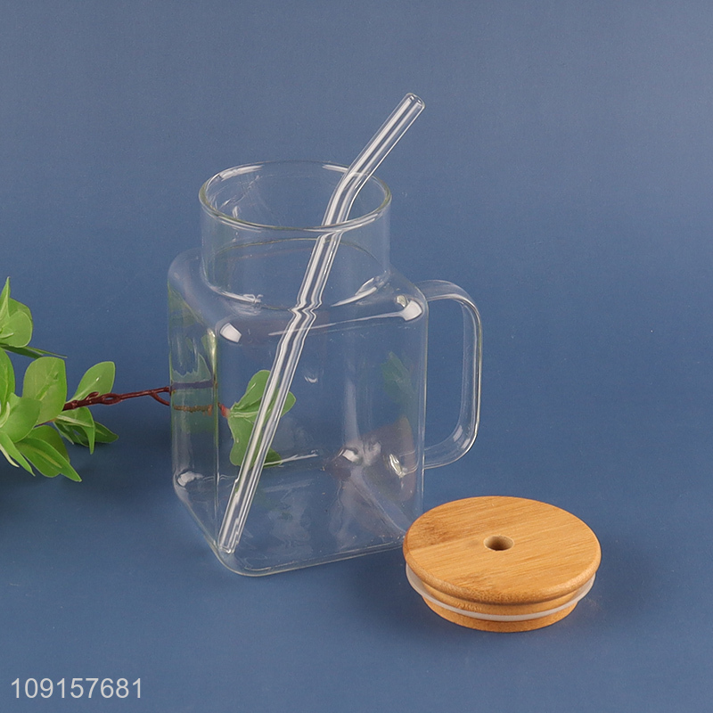 Low price square clear glass coffee cup juice cup with handle&lid