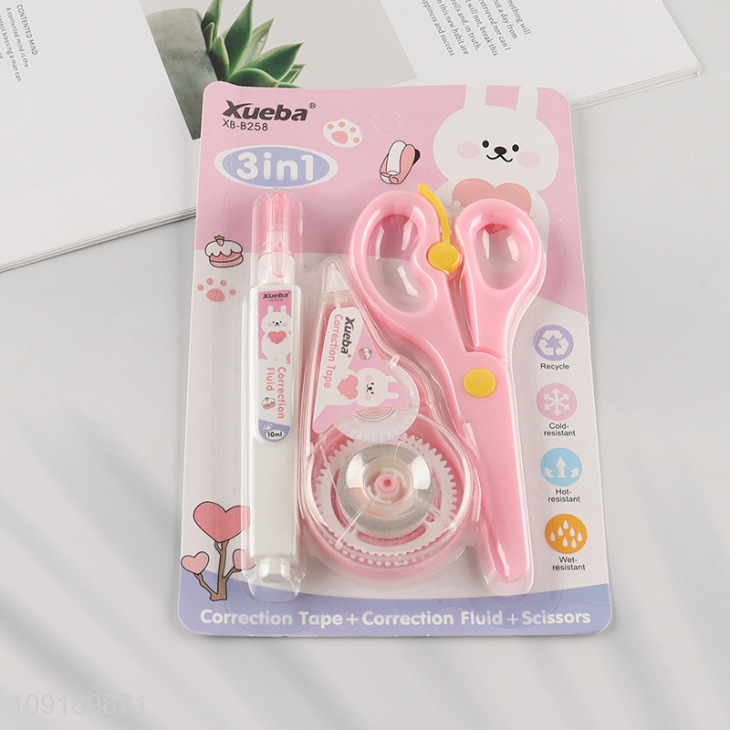 New Product 3PCS Stationery Set with Correction Tape, Correction Fluid and Scissors
