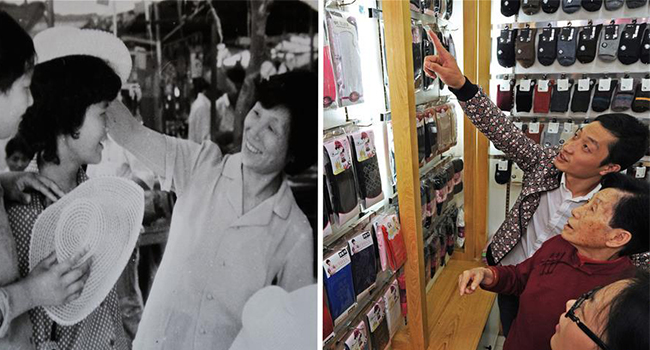 Combined photo shows merchant Feng Aiqian (right in the left photo) selling sunbonnet in Yiwu in 1980s and Feng Aiqian (center in the right photo) of 78 years old visiting a sock store of her grandson in Yiwu, east China's Zhejiang Province, Oct. 25, 2018.